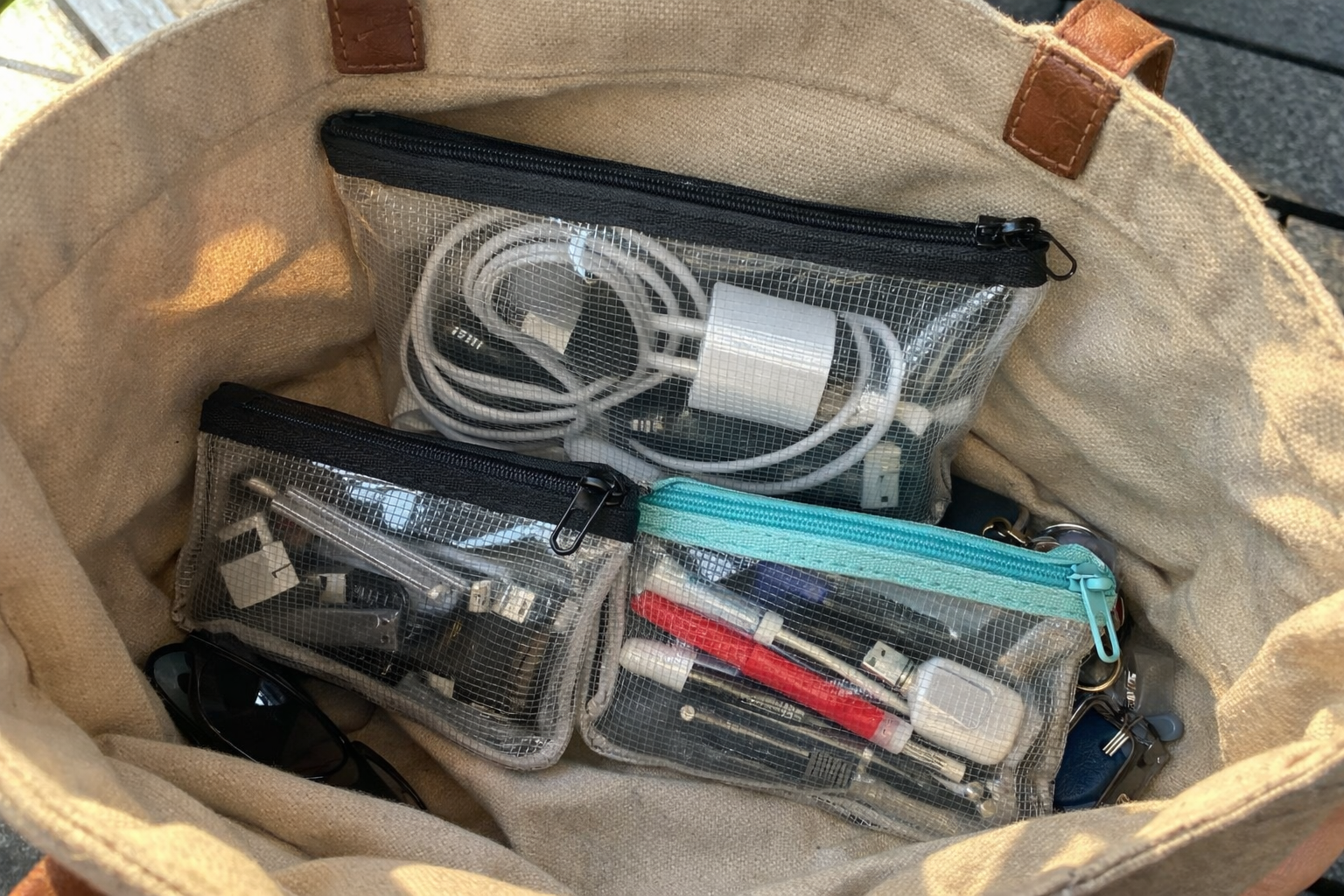 | Clear zipper pouches | Keeps small gear visible and separated | Cables, pens, adapters, tiny essentials |